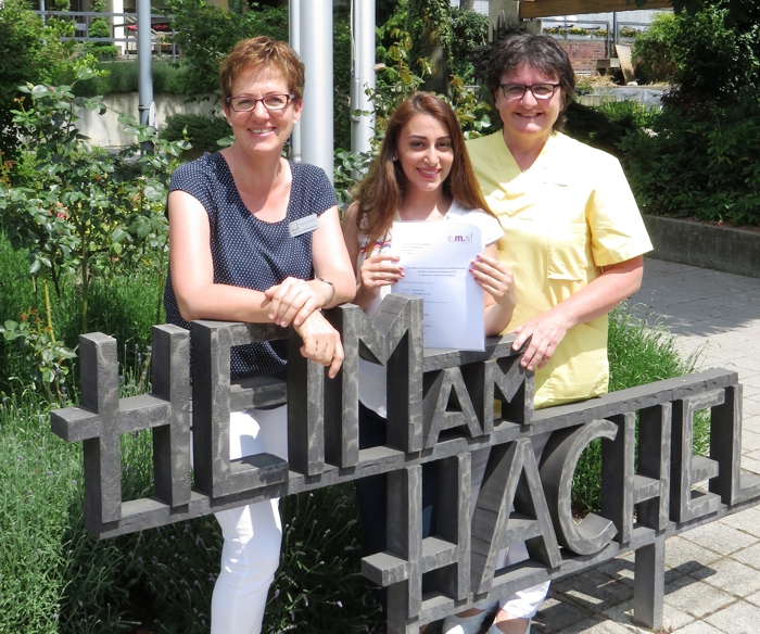 Marina Mikha ist eine junge Irakerin, die in ihrer Heimat Rechtswissenschaften studiert und 2014 dort ihren Bachelor gemacht hat. Mit Teilen ihrer Familie lebt sie seit März 2016 in Keltern. Nach einigen Praktika und ehrenamtlichen Aktivitäten hat sie sich dazu entschlossen, hier in Deutschland ihren beruflichen Werdegang zunächst mit einer Ausbildung zu beginnen, um so auch ihre Sprachkenntnisse weiter verbessern zu können. Im September dieses Jahres wird Marina daher im Heim am Hachel in Pforzheim eine Ausbildung zur staatlich anerkannten Alltagsbetreuerin beginnen. Pflegedienstleiterin Barbara Wittenzellner erklärte sich nach der Hospitation gerne bereit, ihr einen Ausbildungsplatz anzubieten; gegenüber dem gemeindlichen Integrationsbeauftragten Stefan Schröck, der die Ausbildungssuche koordinierte, beschrieb sie Marina Mikha "als eine sehr sympathische und intelligente junge Frau, die über viel Empathie und Charisma verfügt".