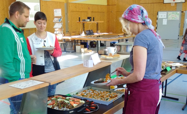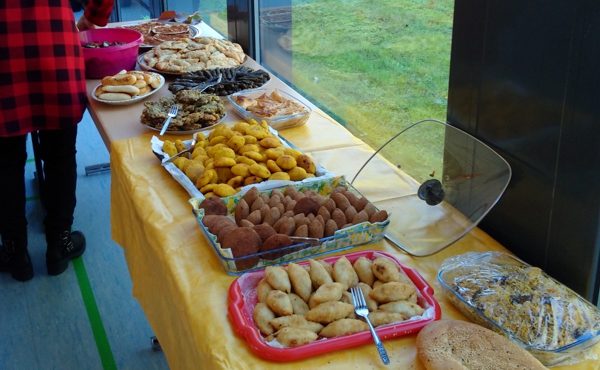 Kelterner "Arbeitskreis Flüchtlinge" feiert am 14.10.2017 mit interkulturellen Speisen - Zum gemeinsamen Austausch trafen sich Ehrenamtliche vom Kelterner Arbeitskreis Flüchtlinge, Bürger und Neubürger bei internationalen Speisen, die die Flüchtlinge zubereitet hatten: "In Keltern gefällt es uns sehr gut", stelle Beyan aus Syrien hinter einer Platte volle Kibbeh-Klößen fest - eine Spezialität im Nahen Osten aus Hackfleisch, Zwiebeln und Bulgur, wie die 17-Jährige fließend auf Deutsch erklären kann: "Die Sprache haben wir zuerst über die Kirche und dann in der Schule in Pforzheim gelernt. Das ist wichtig für uns, sonst könnten wir keinen Kontakt haben.