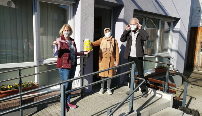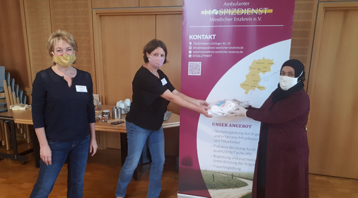 Bei der Übergabe von 70 Masken an den Ambulanten Hospizdienst Westlicher Enzkreis erklärt Maha Alkalaf im Gespräch mit Heidi Kunz und Ute Sickinger die Beweggründe für ihre Aktion. "In den vergangenen Jahren haben viele Menschen in Keltern uns geholfen, jetzt helfen wir", so die Syrerin, die mit ihrer Familie seit Ende 2015 in Keltern lebt.